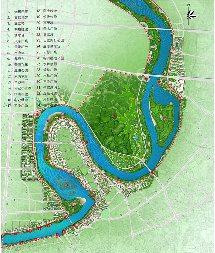 規(guī)模:總用地面積9.3平方公里,其中建設(shè)用地5.9平方公里,水域面積3.4平方公里(含河岸灘涂與島嶼)。